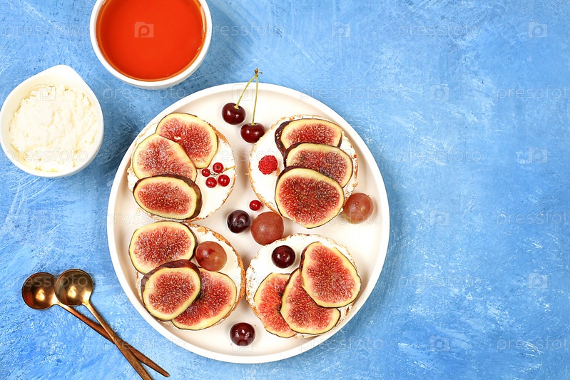 Рикотта, инжир и брускетта с медом на голубом мраморе. Свежие бутерброды и тосты со сливочным сыром, нарезанным инжиром, медом и вишней. Здоровый завтрак с ингредиентами, обед или десерт, концепция диетического питания, выборочный фокус