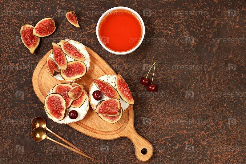 Здоровый завтрак с ингредиентами, тост с инжиром и мягким сливочным сыром, рикоттой и медом, канапе или кростини с поджаренным багетом и травами на темном бетонном столе, меню итальянских рецептов,