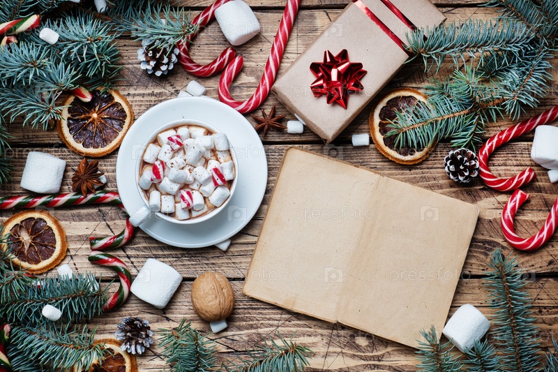 Чашка горячего шоколада с зефиром в руках мужчины в свитере. Рождественская елка и украшения, тростниковая карамель и апельсиновые орехи. Деревянное пространство для копирования фона. Новогодний подарок