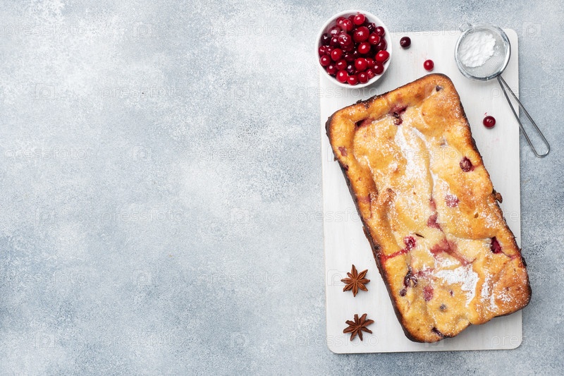 Запеканка из творожного пирога с клюквой и специями, посыпанная сахарной пудрой на деревянной подставке. Серый бетонный стол. Копировать пространство
