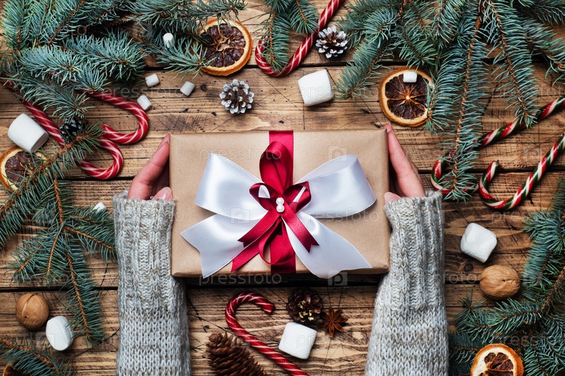 Женские руки держат подарочную коробку с бантом. Рождественская елка и украшения, тростниковая карамель и апельсиновые орехи Деревянный фон