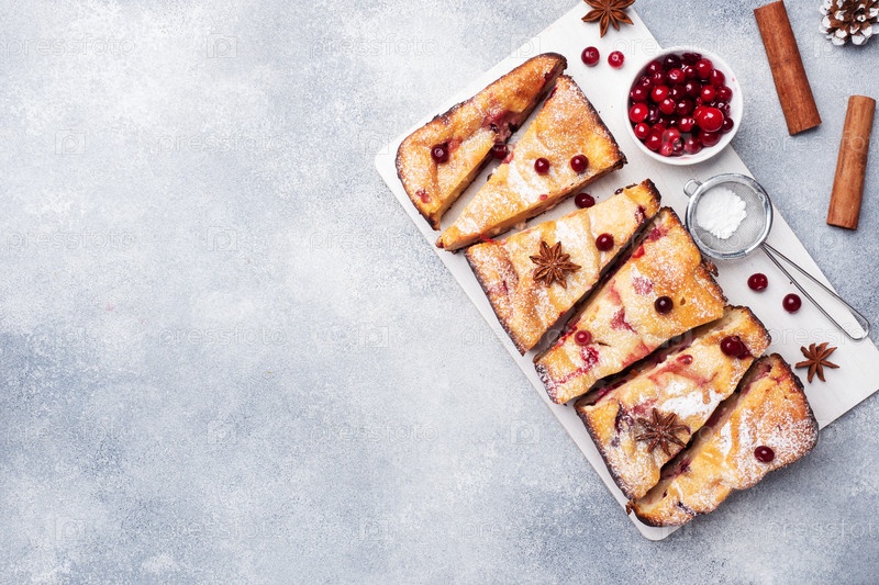 Запеканка из творожного пирога с клюквой и специями, посыпанная сахарной пудрой на деревянной подставке. Серый бетонный стол. Копировать пространство