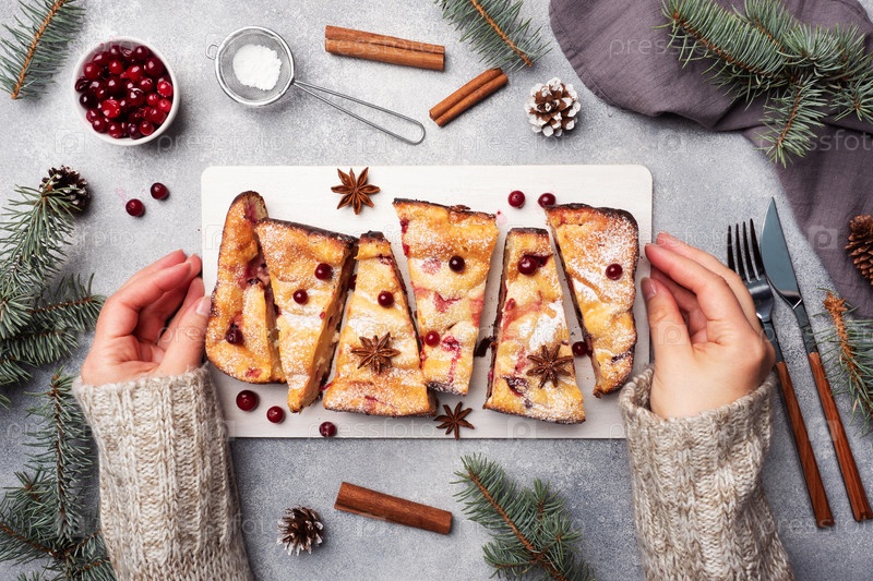 Женские руки держат подставку с творожной запеканкой с клюквой и специями, посыпанной сахарной пудрой. Серый бетонный стол