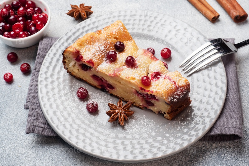 Кусок творожного пирога с ягодами клюквы и специями, корицей и анисом на тарелке. Серый бетонный фон