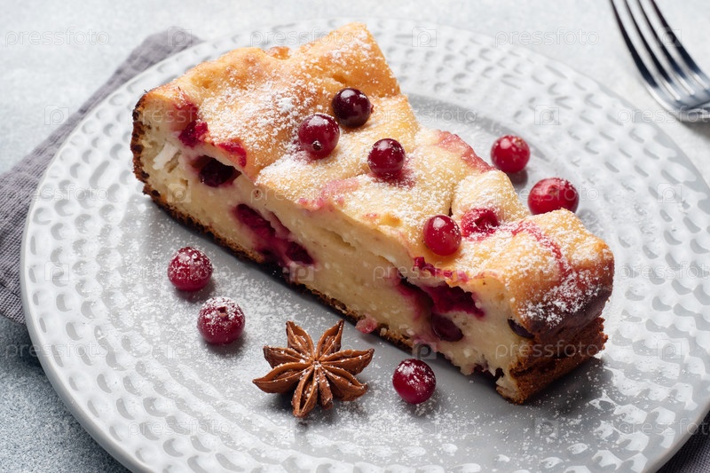 Кусок творожного пирога с ягодами клюквы и специями, корицей и анисом на тарелке. Серый бетонный фон