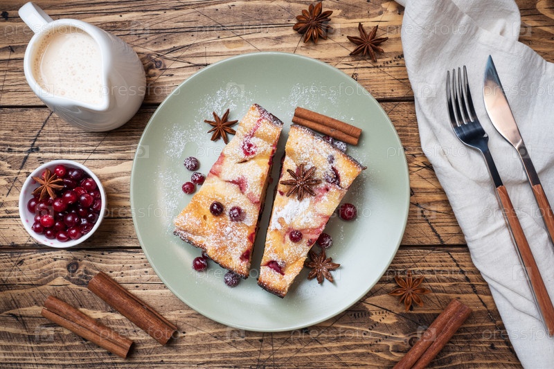 Два куска творожного пирога с ягодами клюквы и специями, корицей и анисом на тарелке. Деревянный фон