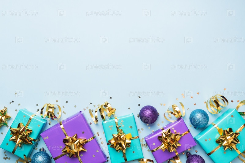 Плоский фон для празднования Рождества и Нового года. Подарочные коробки фиолетового и бирюзового цвета с бантами из золотых лент и звездами конфетти на синем фоне. пространство для копирования вида сверху