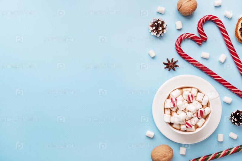 Чашка горячего шоколада с какао-порошком зефира и карамельными орехами, апельсинами на пастельно-голубом фоне с копировальным пространством. Рождественская зимняя концепция