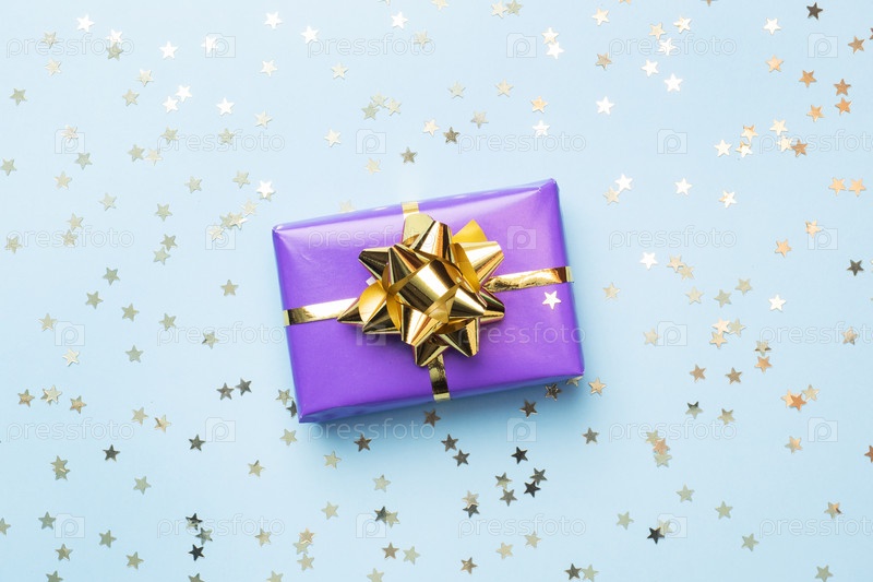 Плоский фон для празднования Рождества и Нового года. Подарочные коробки фиолетового цвета с золотыми лентами, бантами и звездами конфетти на синем фоне. пространство для копирования вида сверху