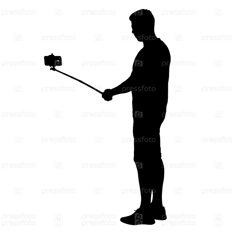 Силуэты мужчины, делающего селфи со смартфоном на белом фоне