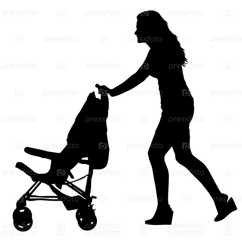 Силуэты гуляющих матерей с детскими колясками на белом фоне