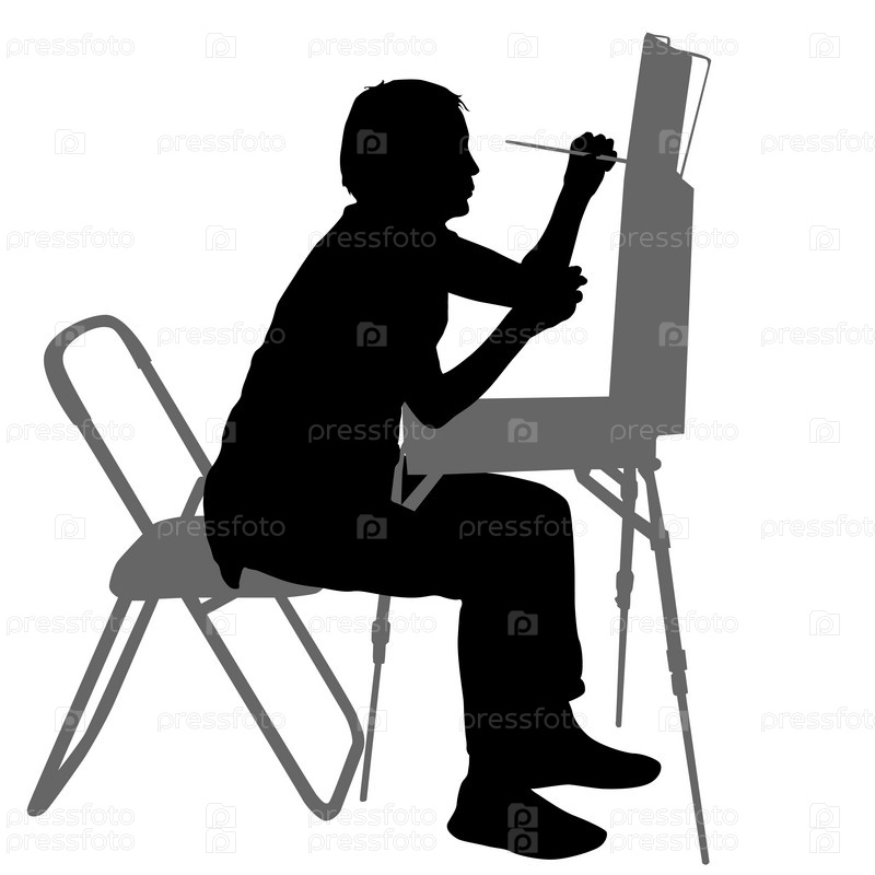 Силуэт, художник за работой на белом фоне