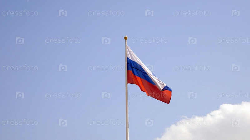 Российский флаг на флагштоке развевается на ветру на фоне голубого неба с облаками, Российский флаг на флагштоке развевается на ветру на фоне голубого неба с облаками