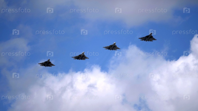 МОСКВА, РОССИЯ - 7 мая 2021 года: Авиапарад в Москве. Сухой Су-57 в небе на параде Победы во Второй мировой войне в Москве, Россия