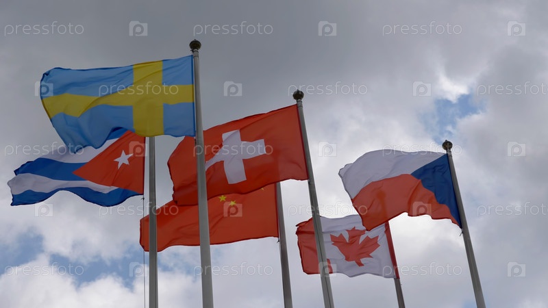 Различные национальные флаги с флагом ЕС под голубым небом., Различные национальные флаги с флагом ЕС под голубым небом