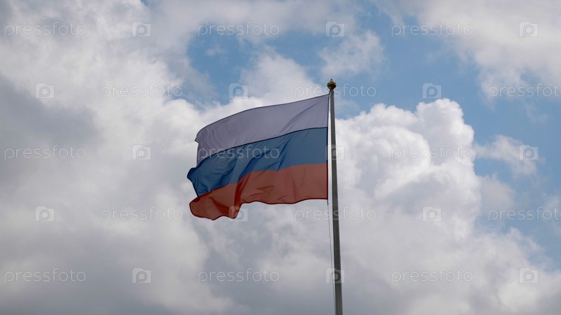 Российский флаг на флагштоке развевается на ветру на фоне голубого неба с облаками