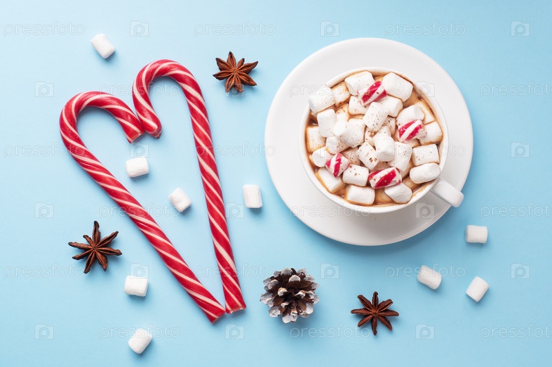 Чашка горячего шоколада с какао-порошком зефира и карамелью на пастельно-голубом фоне с копировальным пространством. Рождественская зимняя концепция