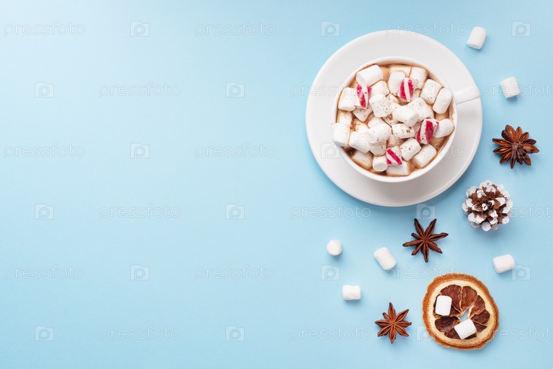 Чашка горячего шоколада с какао-порошком зефира и карамельными орехами, апельсинами на пастельно-голубом фоне с копировальным пространством. Рождественская зимняя концепция