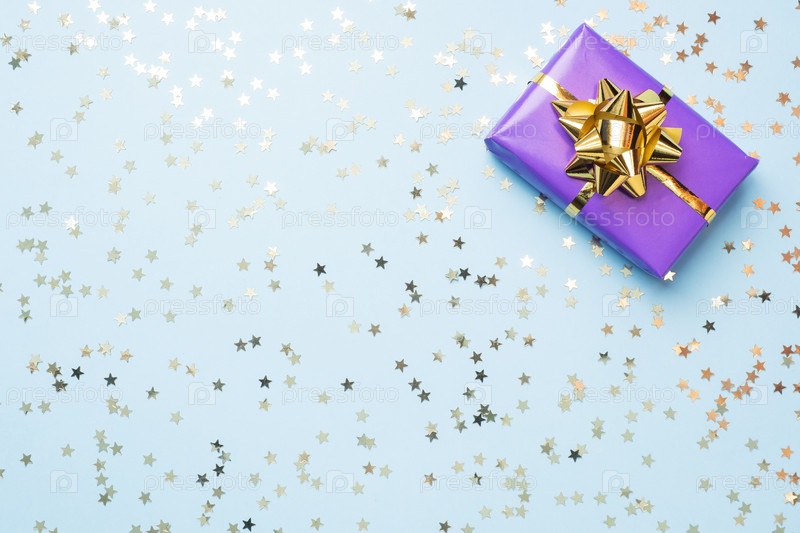 Плоский фон для празднования Рождества и Нового года. Подарочные коробки фиолетового цвета с золотыми лентами, бантами и звездами конфетти на синем фоне. пространство для копирования вида сверху