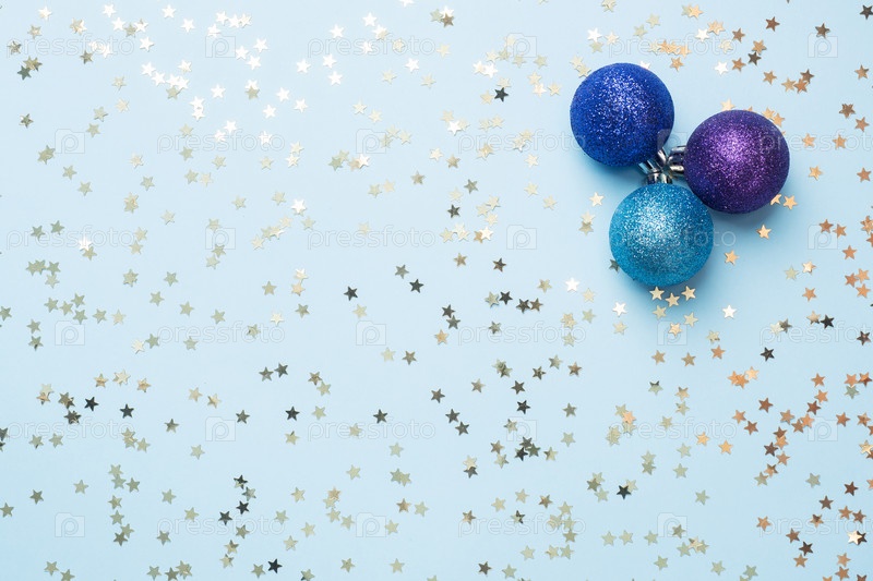 Плоский фон для празднования Рождества и Нового года. Шары фиолетового и бирюзового цвета с бантами из золотых лент и звездами конфетти на синем фоне. пространство для копирования вида сверху