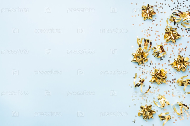 Плоский фон для празднования Рождества и Нового года. золотые ленты, банты и звезды конфетти на синем фоне. пространство для копирования вида сверху