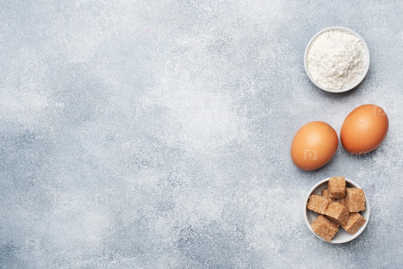 Ингредиенты для выпечки печенья, кексов и торта. Сырые продукты, яйца, мука, сахар на сером фоне с копировальным пространством