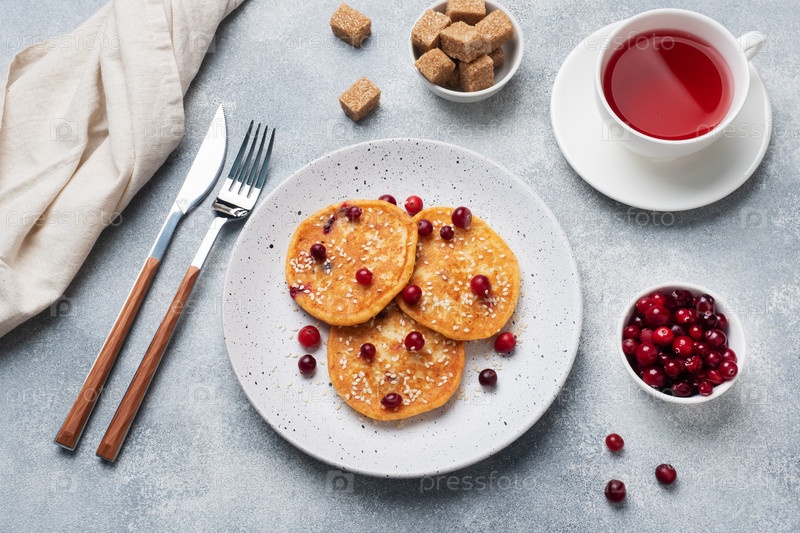 Сырники с клюквой. Русские сырники или сырники, творожные оладьи или блины на тарелке