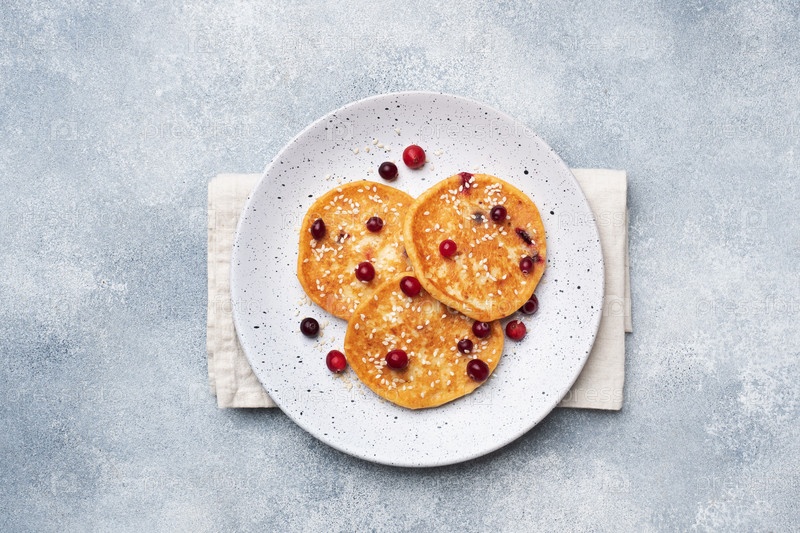 Сырники с клюквой. Русские сырники или сырники, творожные оладьи или блины на тарелке