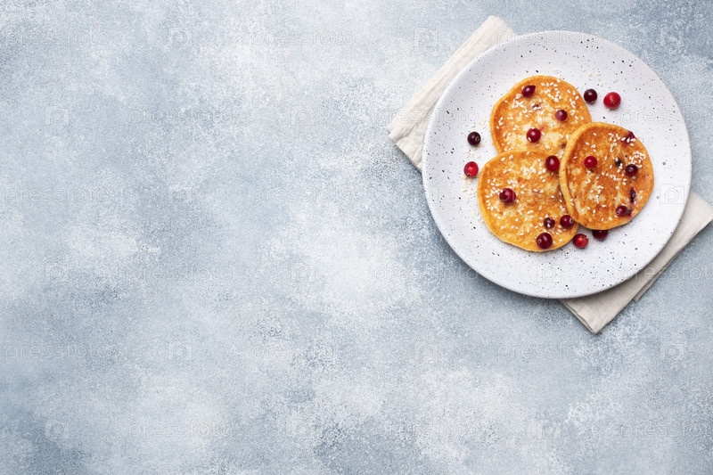 Сырники с клюквой. Русские сырники или сырники, творожные оладьи или блины на тарелке