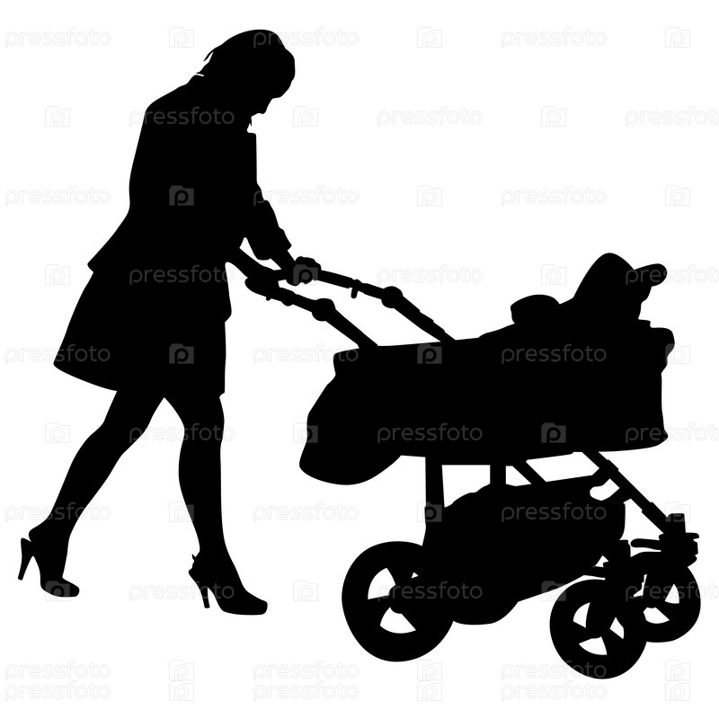 Силуэты прогуливающихся матерей с детскими колясками на белом фоне