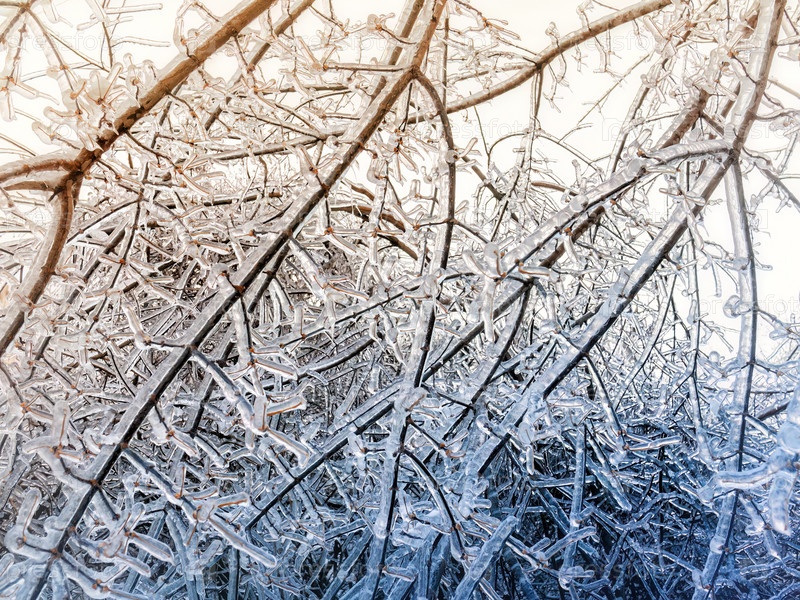 Ветви деревьев в ледяной глазури после ледяного дождя зимой на фоне неба в теплых и холодных оттенках. Крупный план. Селективный фокус. Горизонтальный. Владивосток ноябрь 2020 г