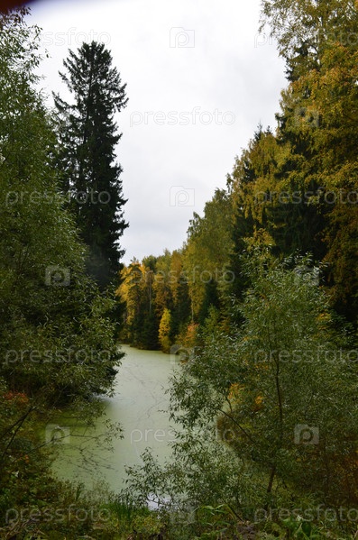 Озеро, покрытое зеленой ряской среди деревьев с разноцветной листвой осенью