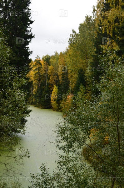 Озеро, покрытое зеленой ряской среди деревьев с разноцветной листвой осенью