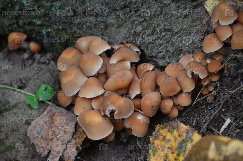 Грибы Псатирелла водолюбивая (лат. Psathyrella piluliformis) в осеннем лесу