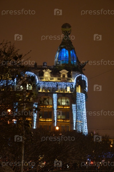 Украшенный к новогодним праздникам Дом компании Зингер (Дом книги) на Невском проспекте в Санкт-Петербурге