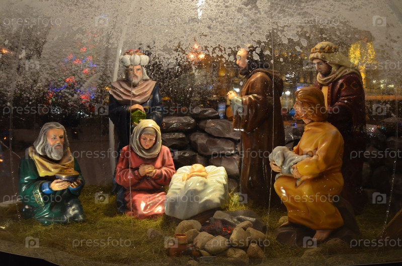 Рождественский вертеп у Казанского собора в Санкт-Петербурге (иллюстрация сцены Рождества Христова и поклонения волхвов)