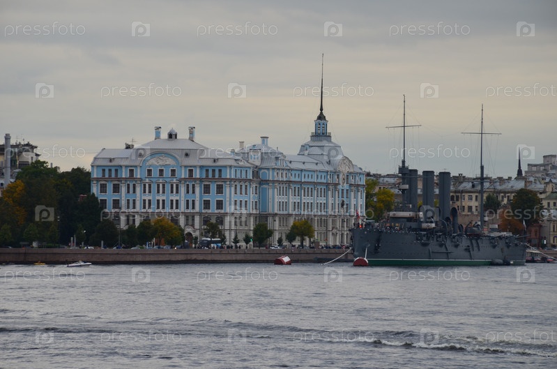 Крейсер Аврора и Нахимовское училище пасмурным осенним днем