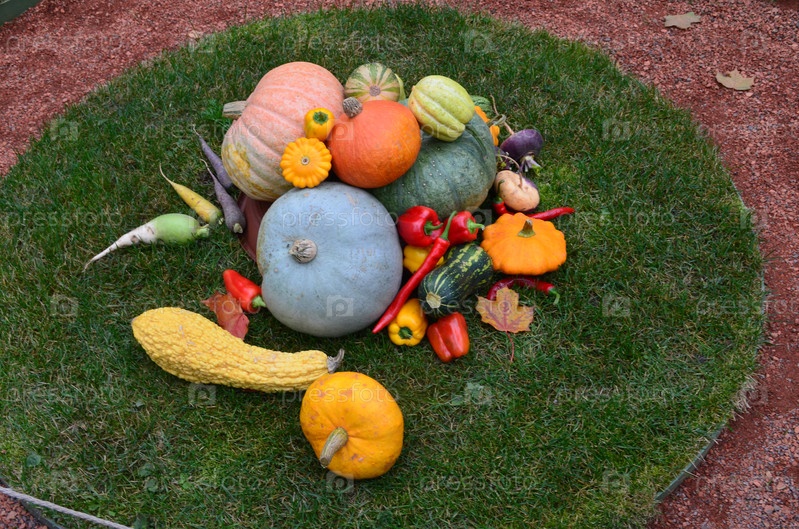 Осенние овощи на зеленом газоне: тыква, кабачок, перец, морковь, свекла