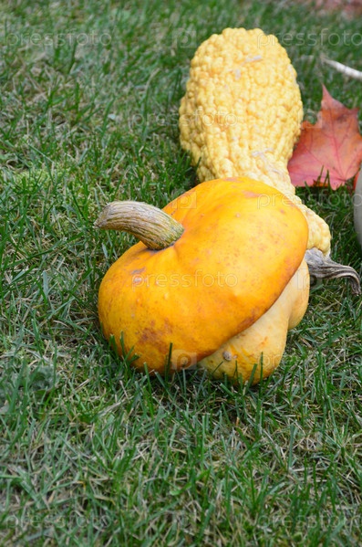Тыквы разной формы на зеленом газон