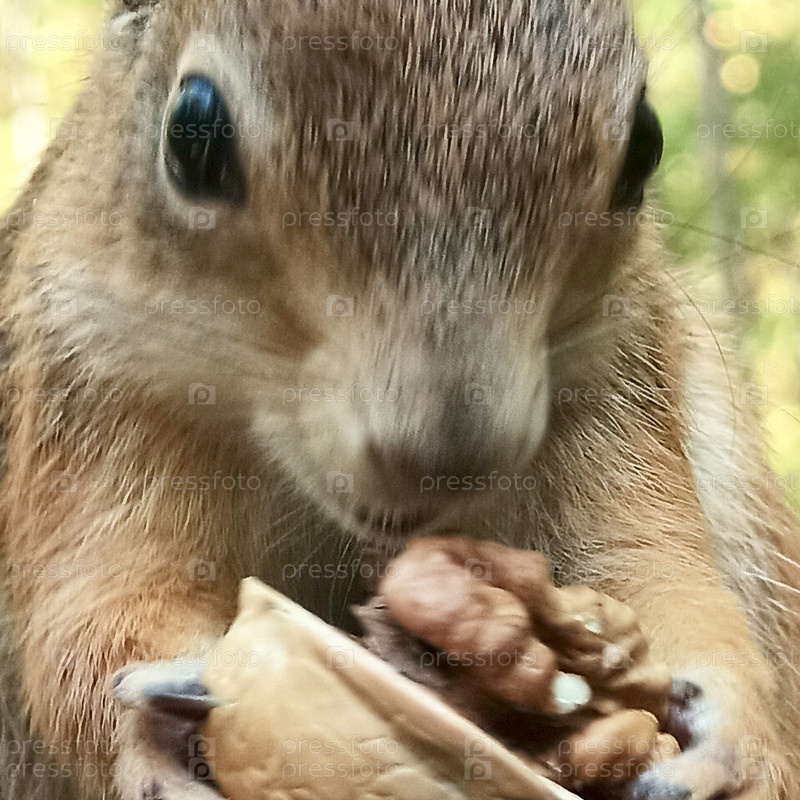 Белочка радостно крупным планом смотрит в глаза держа орех грецкий