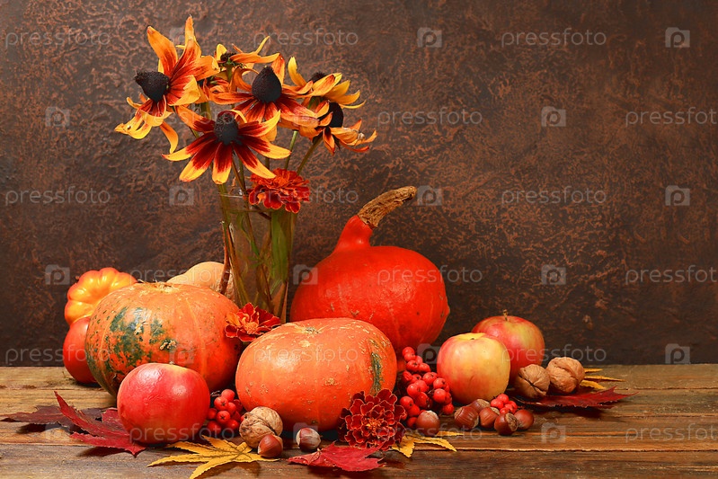 Осенний натюрморт с яблоками, ягодами рябины, тыквами, цветами подсолнечника на старом деревянном столе, фоном, концепцией Дня благодарения, деревенским урожаем, концепцией здорового натурального питания, баннером для экрана, рекламным кафе, рестораном