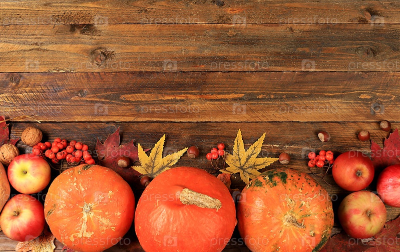 Концепция Дня Благодарения, поздравительная открытка, Осенний фон с сезонными грушами, тыквами, яблоками, листьями и цветами на деревянном фоне, пространство для копирования, Урожай, дары природы