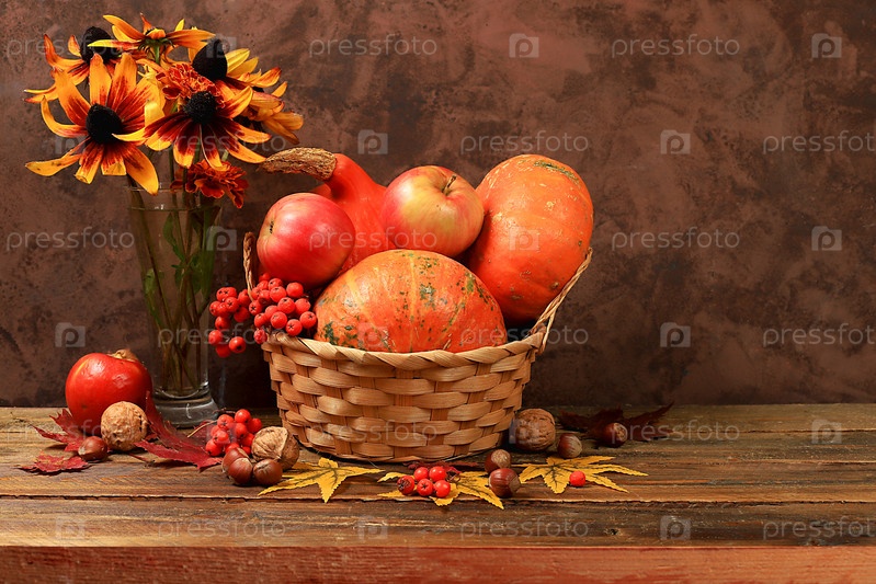 Осенний натюрморт с яблоками, ягодами рябины, тыквами, цветами подсолнечника на старом деревянном столе, фоном, концепцией Дня благодарения, деревенским урожаем, концепцией здорового натурального питания, баннером для экрана, рекламным кафе, рестораном