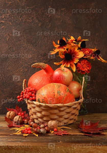 Осенний натюрморт с яблоками, ягодами рябины, тыквами, цветами подсолнечника на старом деревянном столе, фоном, концепцией Дня благодарения, деревенским урожаем, концепцией здорового натурального питания, баннером для экрана, рекламным кафе, рестораном
