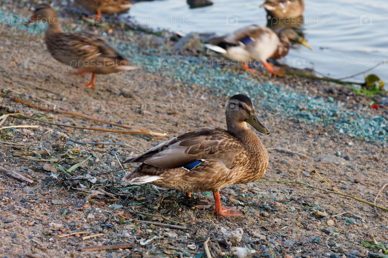 Утка (утица) кряква на берегу реки Которосль рядом с Ярославским музеем-заповедником (Россия, Ярославль)
