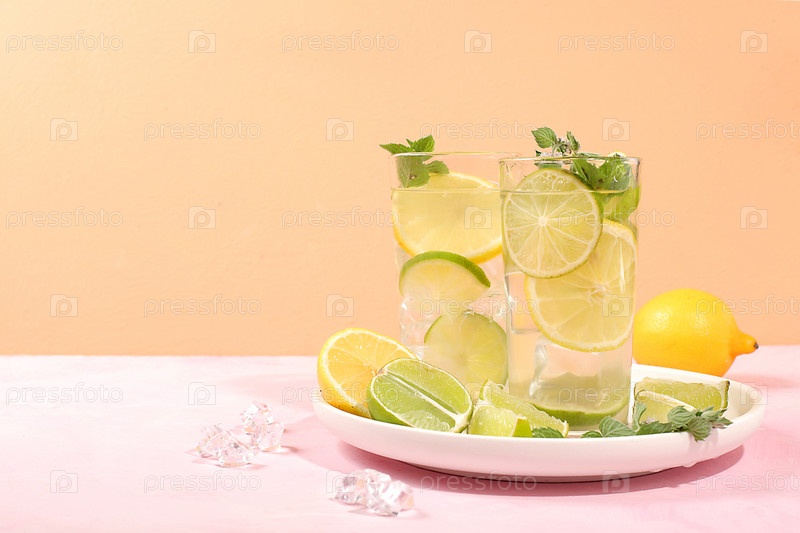 Детокс-напиток с лимоном, мятой, лаймом и апельсином на светлом столе, мохито или коктейлем улучшает обмен веществ, способствует снижению веса и укрепляет иммунитет, концепцию здорового образа жизни,
