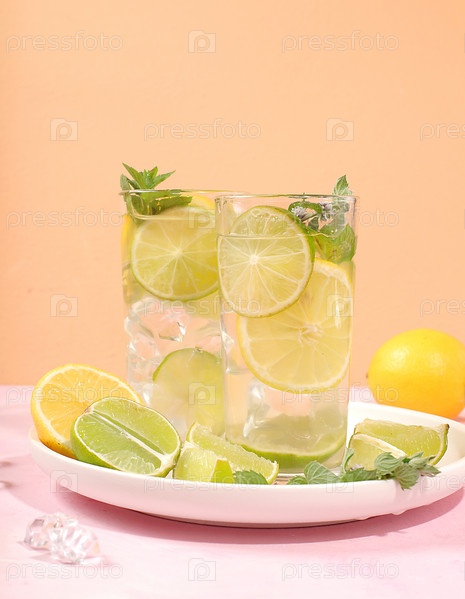 Детокс-напиток с лимоном, мятой, лаймом и апельсином на светлом столе, мохито или коктейлем улучшает обмен веществ, способствует снижению веса и укрепляет иммунитет, концепцию здорового образа жизни,