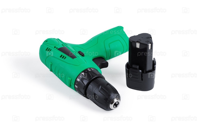 Зеленая аккумуляторная отвертка. Крупный план. Изолированные на белом фоне