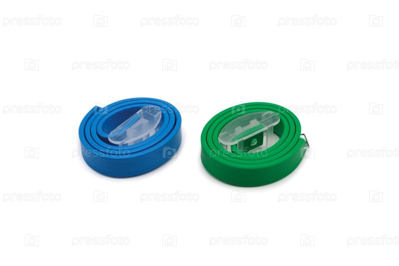 Ошейники от блох синего и зеленого цвета. Крупный план. Изолированные на белом фоне