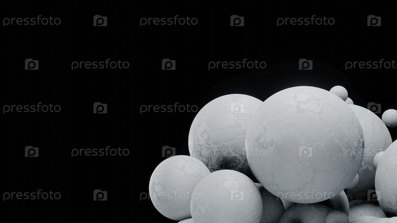 3D-рендеринг, бетонные плавучие сферы с местом для текста, черный фон